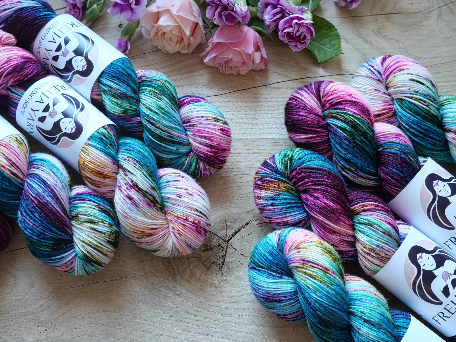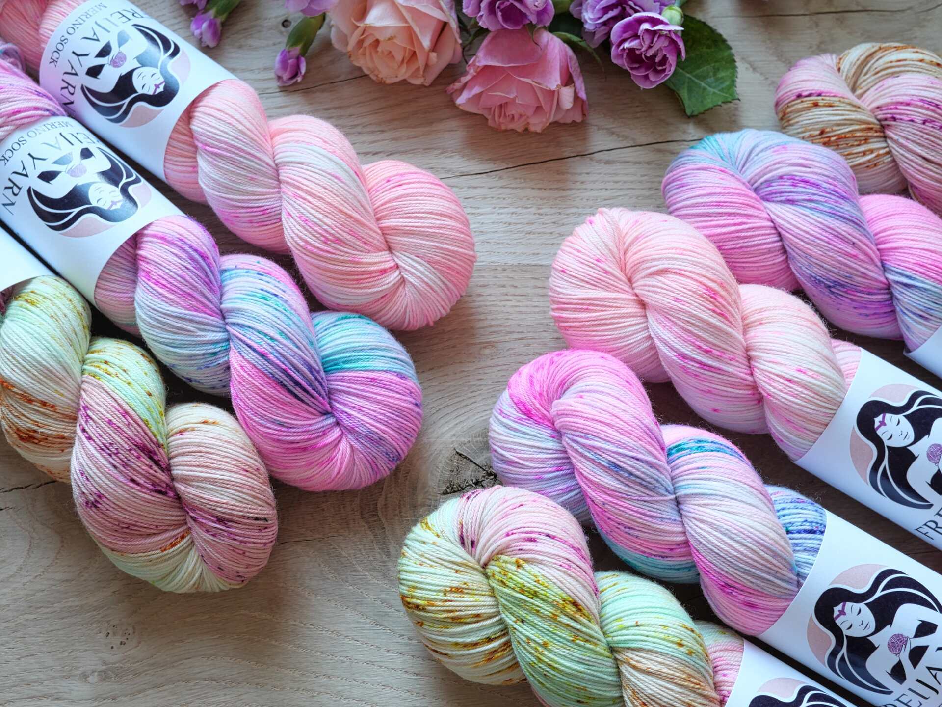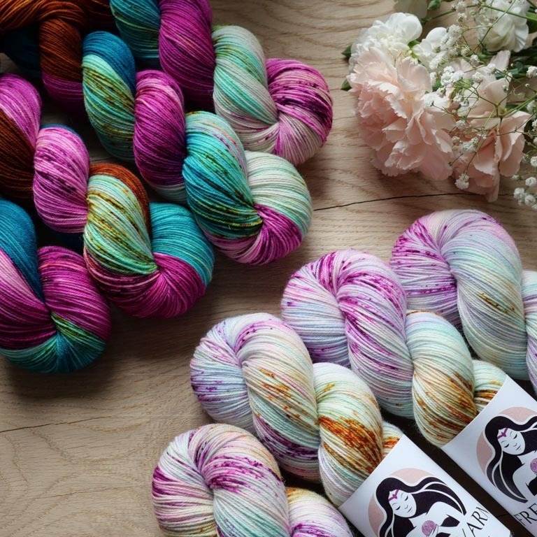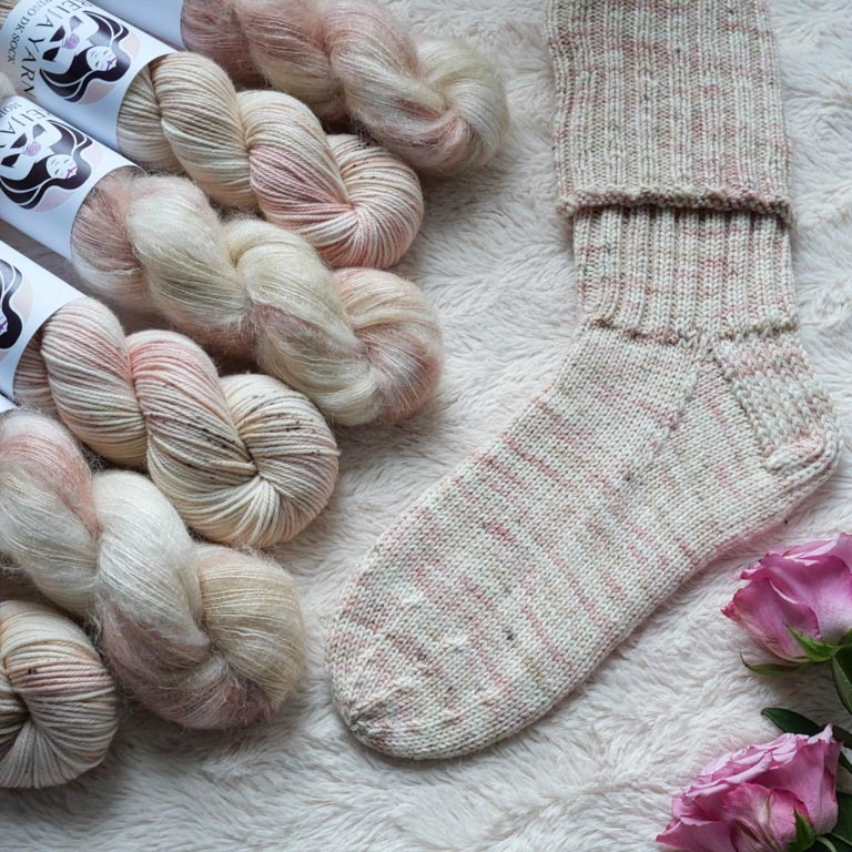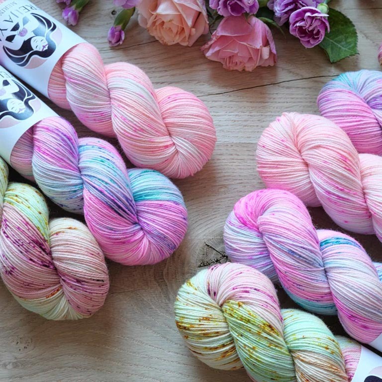 Lankasetit sisältävät vaihtelevasti merino sock ja merino sock stellina (glitter) vyyhtejä. Sopii loistavasti sukkiin sekä neulepuseroihin, mutta myös huiveihin, lapasiin ja muihin asusteisiin. Langassa on ihanan pehmeää superwash käsiteltyä merinovillaa ja kulutusta kestävää nylonia.